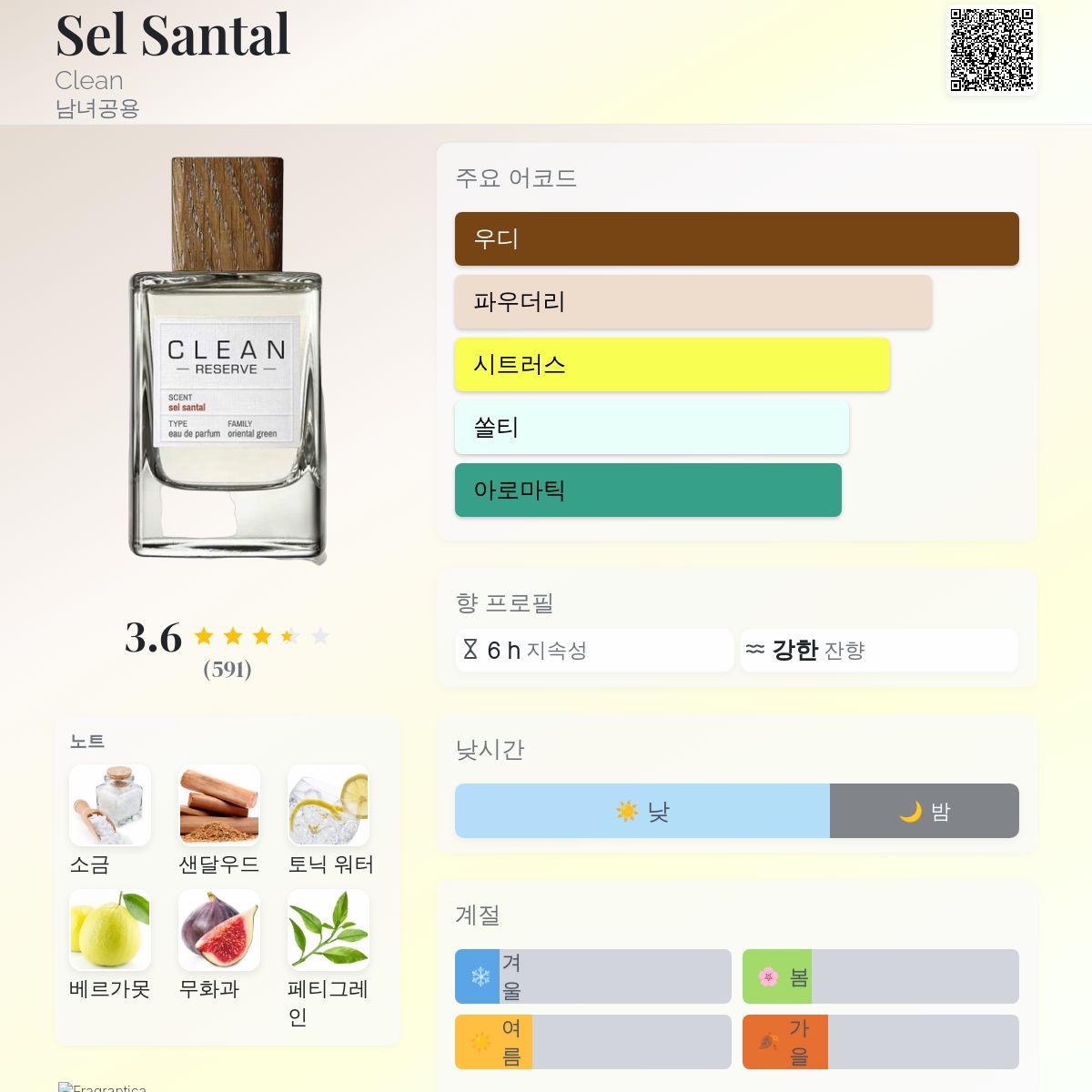 바로 포기하지는 않았어요. 향은 신선하고 청량하며 상큼하게 시작되고, 좋은 변주를 보여주며 지속력도 만족스러웠지만, 안타깝게도 저에게는 완전한 'NO'였어요. 결국 친구에게 선물했는데, 그 친구는 오히려 이 향수를 무척 좋아하며 제 행동을 이해하지 못하더군요. 몇 년 후, Le Labo의 열렬한 팬인 다른 친구가 유명한 Santal 33을 맡게 해주었는데, 첫 향을 맡자마자 후각 기억의 파일이 열렸어요. 바로 Sel Santal이었죠. 훨씬 비싼 Le Labo의 가장 훌륭한 복제품이라고 생각해요 😌