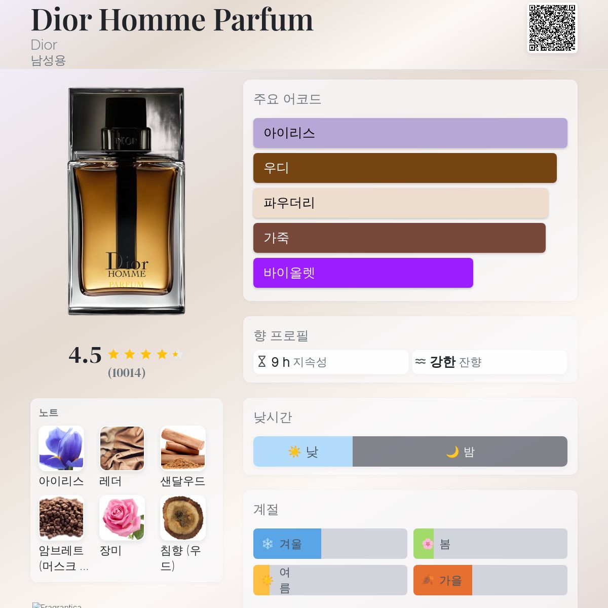 디올 옴므 퍼퓸. 100ml 최신 버전을 말하는 것이지, 이전 버전(들)이 아닙니다. 오프닝은 전작들보다 더 가루 같고 꽃향기가 나며, 전작들은 더 가루 같고 가죽 향이 강했습니다. 드라이다운은 꽃향기 성분을 유지하면서 가죽 어코드, 아이리스 뿌리, 샌달우드와 함께합니다. 우드는 느껴지지 않습니다. 이전 버전에서는 머스크가 가미된 우디 노트가 더 진했습니다. 결론적으로, 여전히 기준에 부합하지만 조금 더 꽃향기가 나고 산뜻하며(이 점은 마음에 듭니다), 어둡고 가죽 같은 우디 향은 덜합니다. 안타깝게도, 다시 구매하지 않을 것 같습니다. 솔직히 말해서요. 최근 몇 년간 더 나은 제품을 발견했습니다. 만세라 블랙 프레스티지움과 유사점이 있지만, 마치 악마와 성수를 비교하는 격입니다. 디올의 조향 전략은 특정 건조함을 추구하여 가장 까다로운 원료조차도 대다수 소비자에게 어필할 수 있도록 합니다. 이 효과는 화학적으로도 얻기 어려우므로, 데망시와 그의 협력자들은 존중받을 만합니다. 가죽 향을 좋아하는 분들에게는 다른 향수를 추천합니다: 몬탈레의 '레더 패츌리', 에타 리브르 도랑의 '톰 오브 핀란드'. 디올 옴므 퍼퓸에서는 가죽 향이 매우 은은합니다. 지속력은 훌륭하고, 퍼짐은 상당히 강렬합니다.