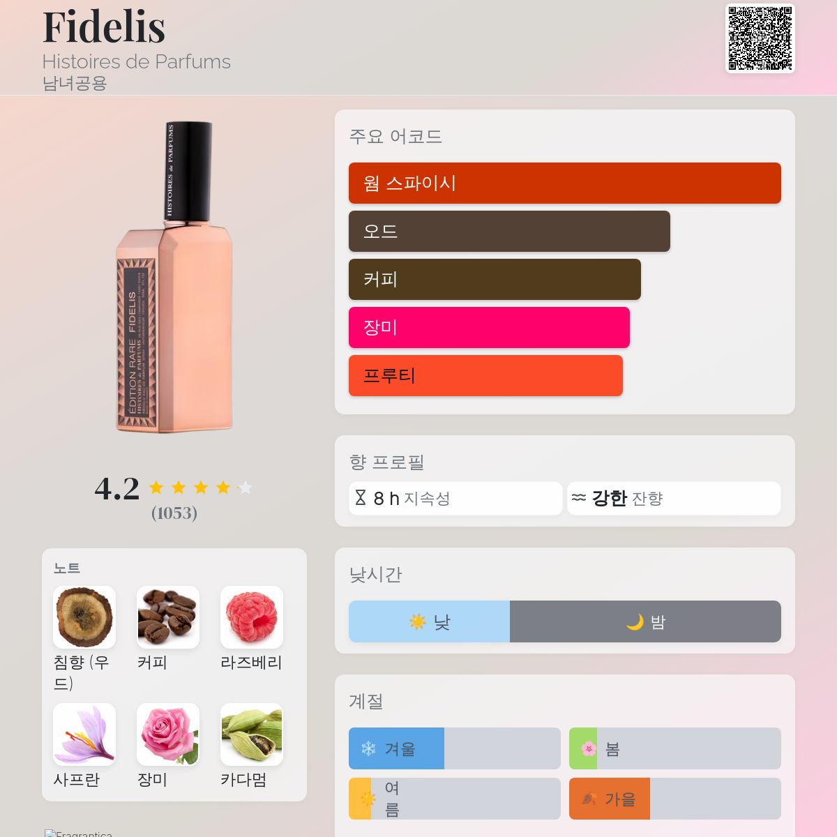 피델리스는 유명 하우스의 일종의 지적인 미식가입니다. 전체적으로 특별히 두드러지거나 독특하지는 않지만, 상당히 능숙하고 설득력 있게 구성된 향입니다. 이 향수는 현재 향수 시장에서 상업적으로 성공한 여러 요소를 흡수했습니다.여기에는 아모아즈의 남성용 인터루드와 유사한 연기 자욱한 우디 어코드가 있으며, 포드의 토스카나 가죽에서 모두에게 익숙한 라즈베리와 사프란의 듀엣도 있습니다. 그러나 이 향수가 지속적인 이차성 느낌을 피하고 개성을 드러내는 데 도움이 되는 것은 바로 카다몬과 톰민이 풍부한 커피 어코드와 아름답게 조화를 이루기 때문입니다.텍스처는 매우 향신료 풍미가 강하고, 연기 자욱하며, 크리미하고 믿을 수 없을 정도로 즐겁습니다. 니쉬 향수 시장에서 커피 노트가 단순히 전체 향의 구조에 가벼운 향신료 풍미로 작용하는 것이 아니라, 선명하고 표현력 있는 성격을 지닌 향은 매우 드물다는 점을 언급할 가치가 있습니다.결국 우리는 달콤하고 향긋하며 믿기 어려울 정도로 크리미한 구르만 라떼를 얻게 되는데, 과일 향의 라즈베리 뉘앙스가 스모키한 우드 베이스 위에 깔려 있습니다. 들으면 좋게 느껴지시나요? 그렇습니다. 이 향수는 매우 맛있고 고품질의 합성 성분으로 만들어졌으며, 숙련된 제작 기술 덕분에 세련되고 우아하게 느껴집니다.저는 이 향수를 우선적으로 향수에서 커피 향신료 노트를 좋아하는 분들에게 자신 있게 추천합니다. 왜냐하면 흥미로운 우드 계열의 조화를 즐기는 애호가들에게는 다소 평범한 향으로 느껴질 수 있기 때문입니다.하지만 인터루드를 좋아하는 분들, 특히 여성분들에게는 이 브랜드 특유의 변함없는 세련미를 유지한 채, 좀 더 유럽적인 화려한 구르망 해석이 흥미로울 수 있을 것입니다.