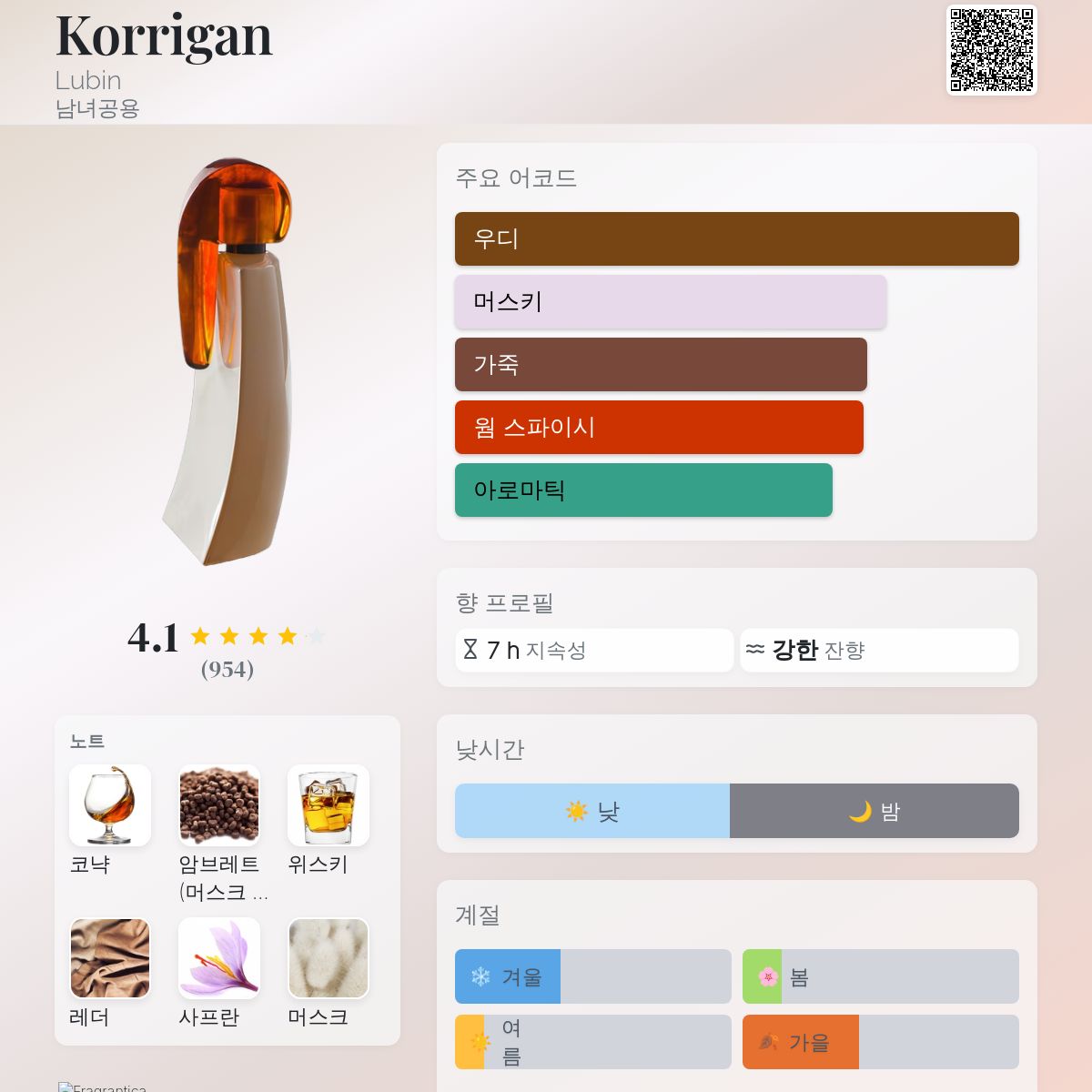 ➡ 코리간? 달콤하고 크리미하며 알코올 향(위스키/코냑)이 나는 향수를 상상해 보세요. 베이스는 머스크입니다. 우드, 시더, 사프란, 가죽(일부만 언급하자면)이 조화를 이루며 구성에 뉘앙스를 더하고, 약간... 음, '더러운' 느낌의 베이스 노트를 선사합니다.