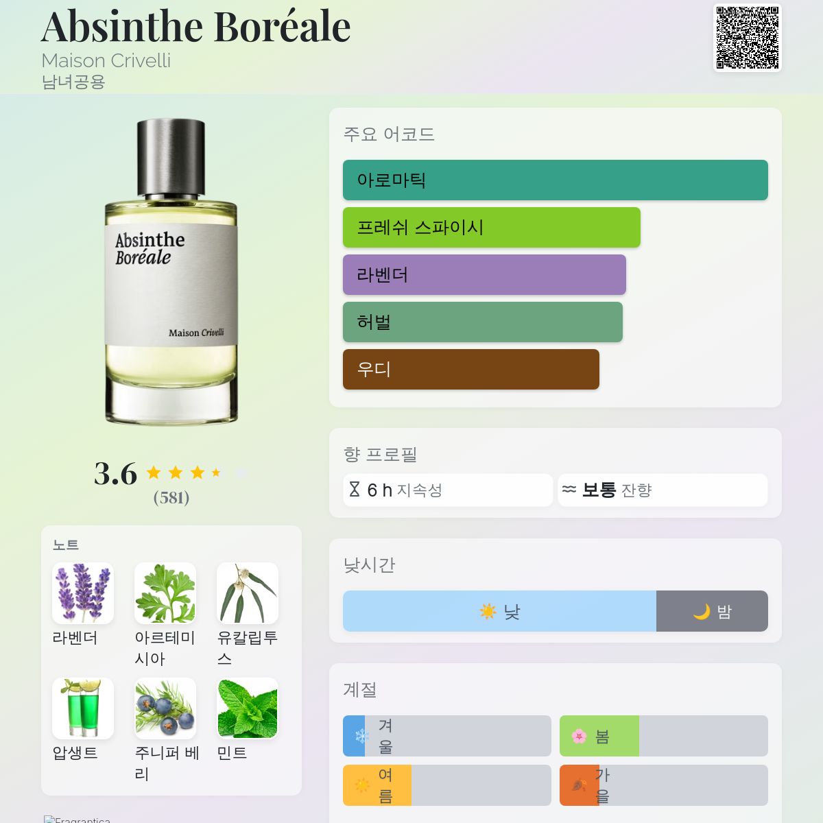 더할 말이 없습니다. '천상의'라는 단어를 강조하고 싶습니다. 이 향이 바로 그 자체이기 때문입니다. 북극광 아래에서 압생트를 마시는 상상을 그대로 구현한 향입니다. 스위스산 차갑고 마법 같은 독약 같은 압생트를 이글루에서 북극광을 바라보며 마시는 그 느낌. 현대적이고 마법 같으며 강렬하게 상쾌하지만, 날카로운 시트러스 향은 아닙니다.
