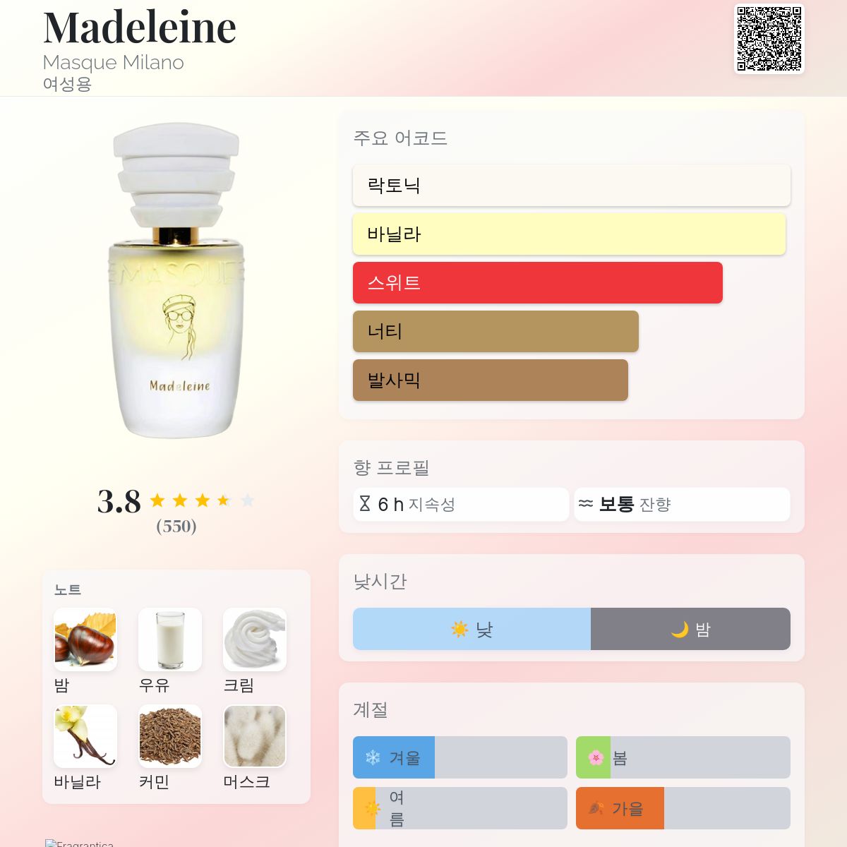 아이고, 이게 무슨 기적인가! 처음 몇 분 동안은 매우 강렬한 견과류와 밤 향이 느껴집니다. 향이 정말 강하다는 점을 염두에 두셔야 합니다. 예상치 못한, 놀라운 향이지만, 그 후에는 얼마나 즐거운지.. 몇 분/십여 분이 지나면 견과류 향이 꽃, 바닐라, 그리고 배경에 은은하게 느껴지는 휘핑크림이 들어간 우유 향으로 바뀝니다. 전체적으로 균형이 잘 잡히고 아름답게 블렌딩되어 개별적인 향을 구분하기 어려울 정도입니다. 서로 완벽하게 조화를 이루며 보완해 줍니다. 매우 우아한 향으로, 가을과 겨울의 주말, 여가 시간, 카페나 제과점에서 수다 떨기, 공원 산책 등에 더 어울리는 것 같습니다. 사무실보다는요. 왜냐하면 초반의 향이 매우 강렬하기 때문입니다. 이렇게 강렬한 견과류 향과 동시에 달콤한 향을 모두가 좋아할 수는 없을 테니까요. 그 후에는 차분해지며, 가장 가까운 주변 사람들만 향을 느낄 수 있고, 결국에는 오직 소유자만의 비밀이 됩니다 :) 지속력은 4-6시간이며, 그 후 2시간은 거의 피부에 밀착된 상태입니다. 커민 향을 걱정하는 분들을 위해: 제 코는 그 향을 감지하지 못했습니다. 몇몇 사람들에게 물어봤는데, 비슷한 의견을 가지고 있었습니다. 샘플을 순식간에 다 써버렸고, 지금은 10ml 병을 가지고 있지만, 다 쓰면 풀사이즈 병을 살 것 같아요. 제 컬렉션에 완벽한 추가가 될 거예요 :) 독특하고 모방할 수 없는 향으로, 마들렌과 비슷한 향을 아직 만나보지 못했어요. 마스크 밀라노, 정말 대단해요!