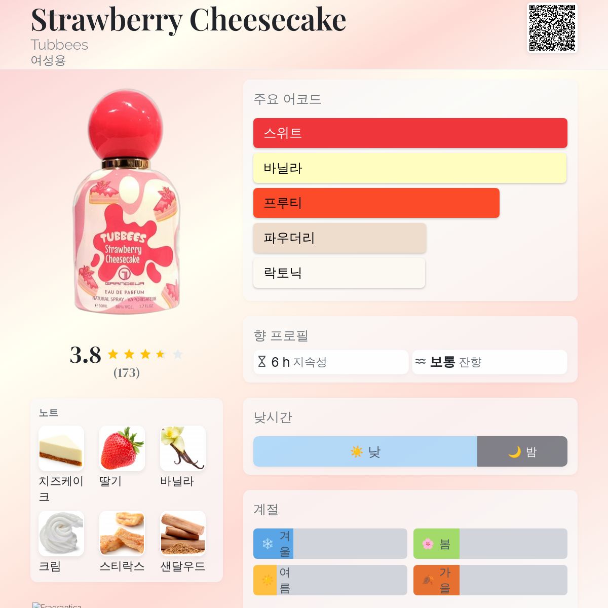 처음엔 좀 역겹고 인공적인 느낌이라 마음에 들지 않았는데, 시간이 지나면서 점점 익숙해지더니 이제는 정말 좋아하게 됐어요! 향이 매우 강해서 뿌릴 때 아주 살짝만 뿌려요. 진짜 딸기 치즈케이크를 연상시키는 향이에요. 달콤한 향이 강해서 무작정 사기엔 부담스러울 수 있지만, 전 개인적으로 마음에 들어요.
